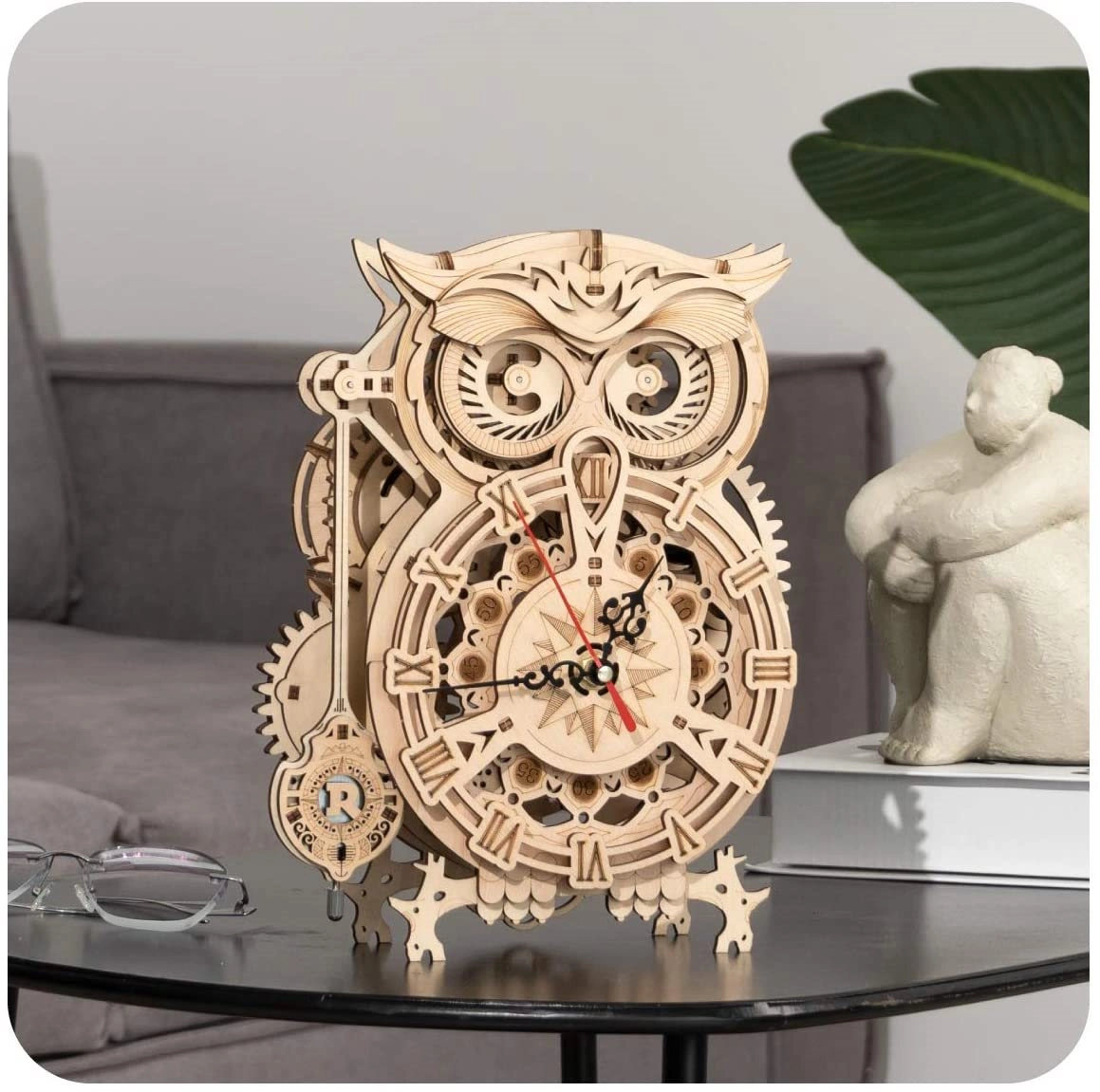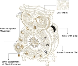 Pelėdos forma su detalizuotais mechaniniais elementais, kurie žavi ir suteikia interjerui elegancijos.