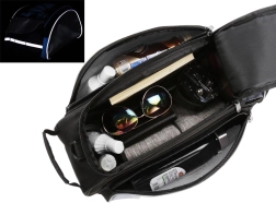 Atšvaitinės juostelės didesniam saugumui ir papildomas dirželis nešiojimui per petį.