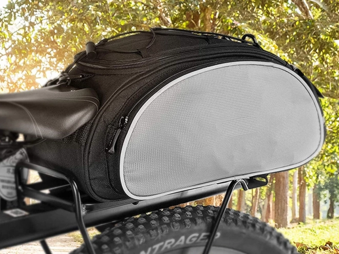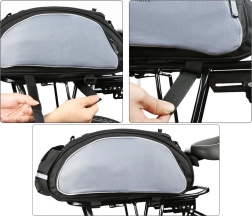 Guminiai laikikliai ant atvarto leidžia saugiai pritvirtinti striukę ar butelį, o atšvaitinės juostelės padidina jūsų saugumą kelyje. Universalus dizainas tinka daugumai dviračių bagažinių, o dėl reguliuojamų sagtelių montavimas yra greitas ir paprastas.