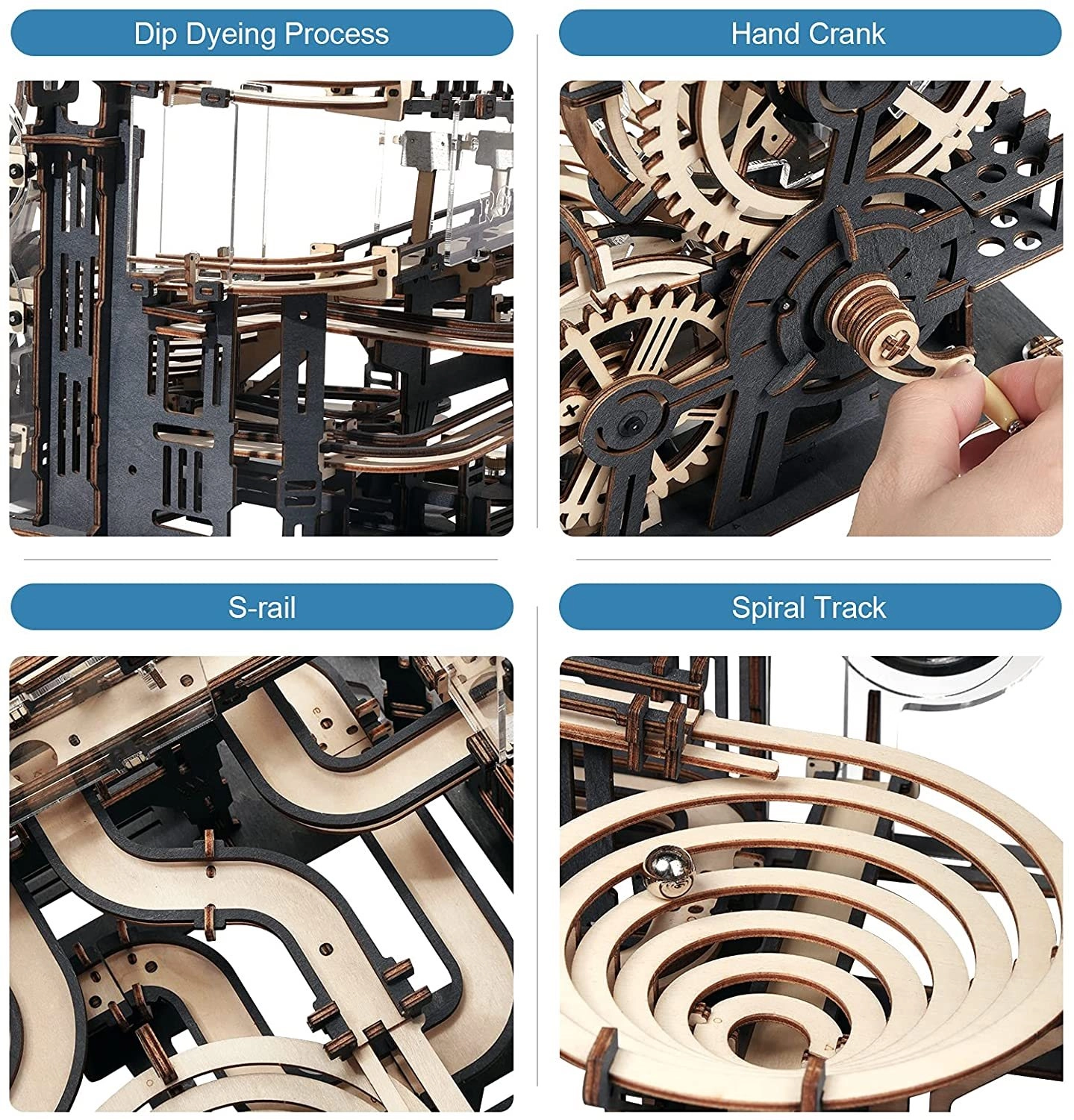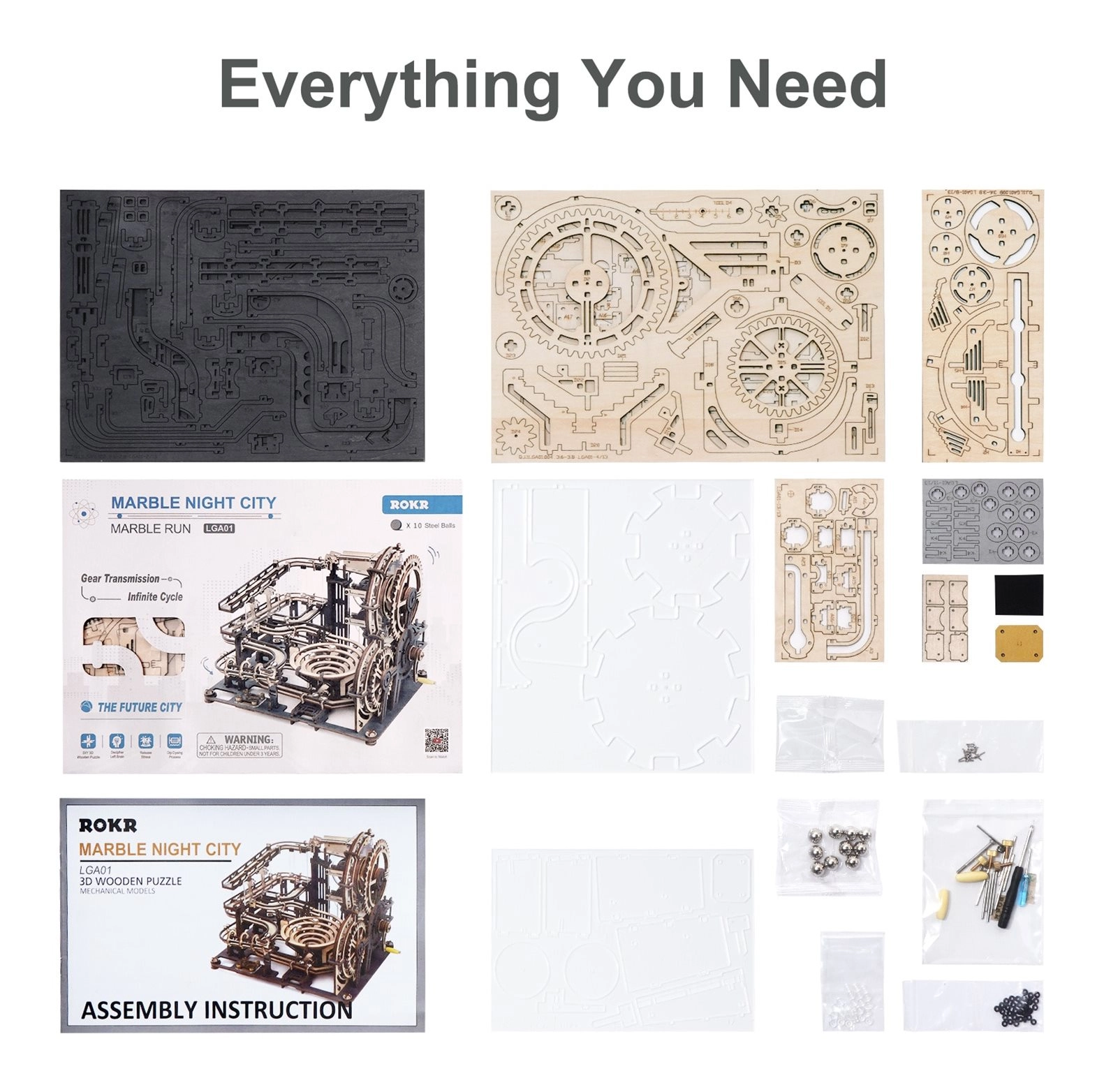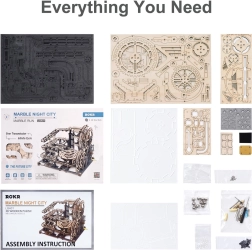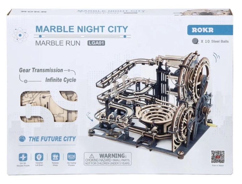 ROKR Marble Night City – įspūdingas 3D surenkamas rutuliukų trasos modelis, derinantis pramogą ir mokymąsi. Modelį sudaro 294 tiksliai išpjautos detalės, kurios sukuria sudėtingą trasą su įvairiomis kliūtimis ir mechanika, varoma rankiniu būdu sukant rankenėlę. Pakuotėje yra išsamus vadovas, kuris padės per visą surinkimo procesą.