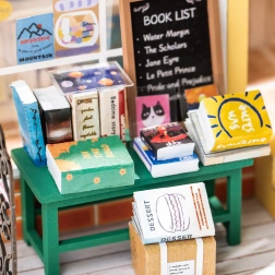 Lentynos su knygelėmis, mielas meškiukas, gėlės ir aksesuarai – kiekviena detalė prisideda prie realistiškos ir žavios mini knygyno išvaizdos.