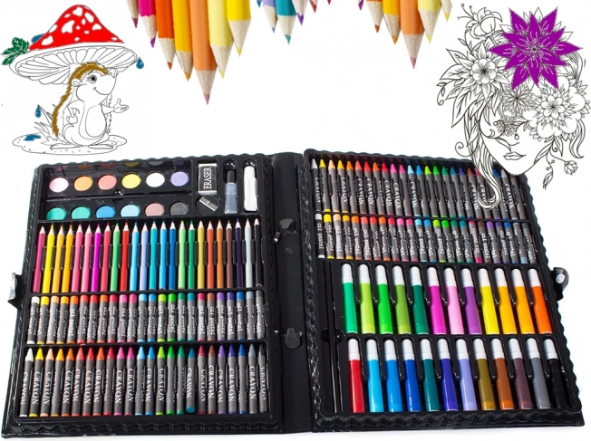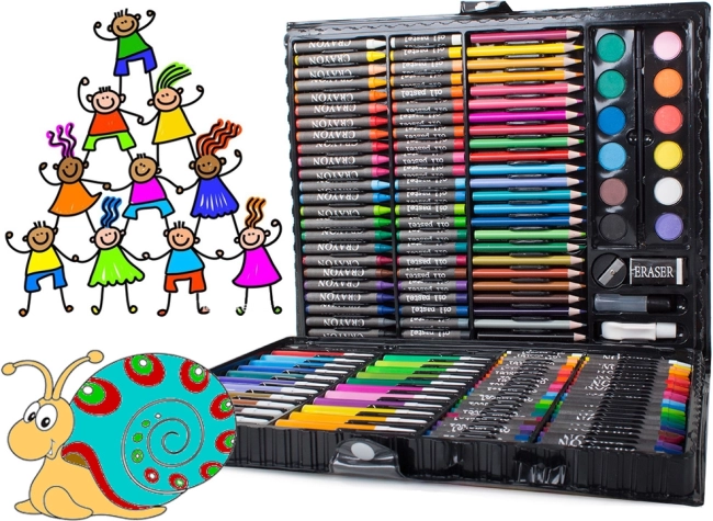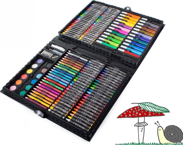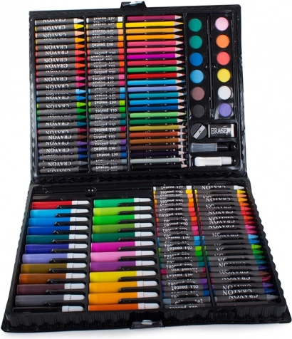 Nuo pieštukų ir flomasterių iki akvarelinių dažų – 168 dalys piešimui, spalvinimui ir tapybai, patogiai sudėtos į aiškų lagaminėlį.