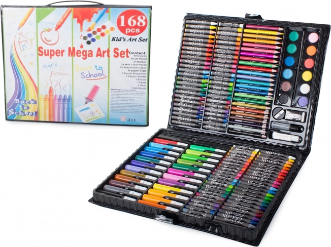 Rinkinyje yra: 48 vaško pastelės, 48 aliejiniai pasteliai, 24 flomasteriai, 24 pieštukai, 12 akvarelinių dažų, teptukas, paletė, drožtukas, trintukas, klijai, korektorius, sąvaržėlė ir 5 A5 formato popieriaus lapai. Dėl tokios gausios komplektacijos lengvai sukursite piešinius, iliustracijas ir tapybos darbus bei lavinsite kūrybiškumą ir smulkiąją motoriką.