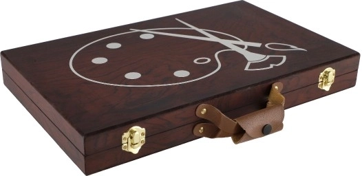 - Visi reikmenys tvarkingai sudėti į medinį lagaminėlį, kurio matmenys 23,5 × 37,5 × 5 cm.
