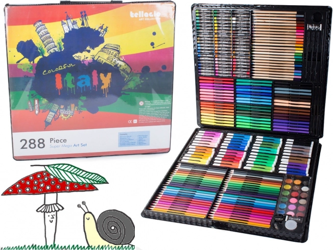 Joje yra viskas, ko reikia kūrybiškumui lavinti: pieštukai, flomasteriai, aliejiniai pasteliai ir akvareliniai dažai – iš viso 288 elementai.