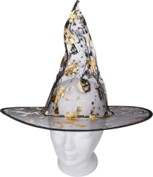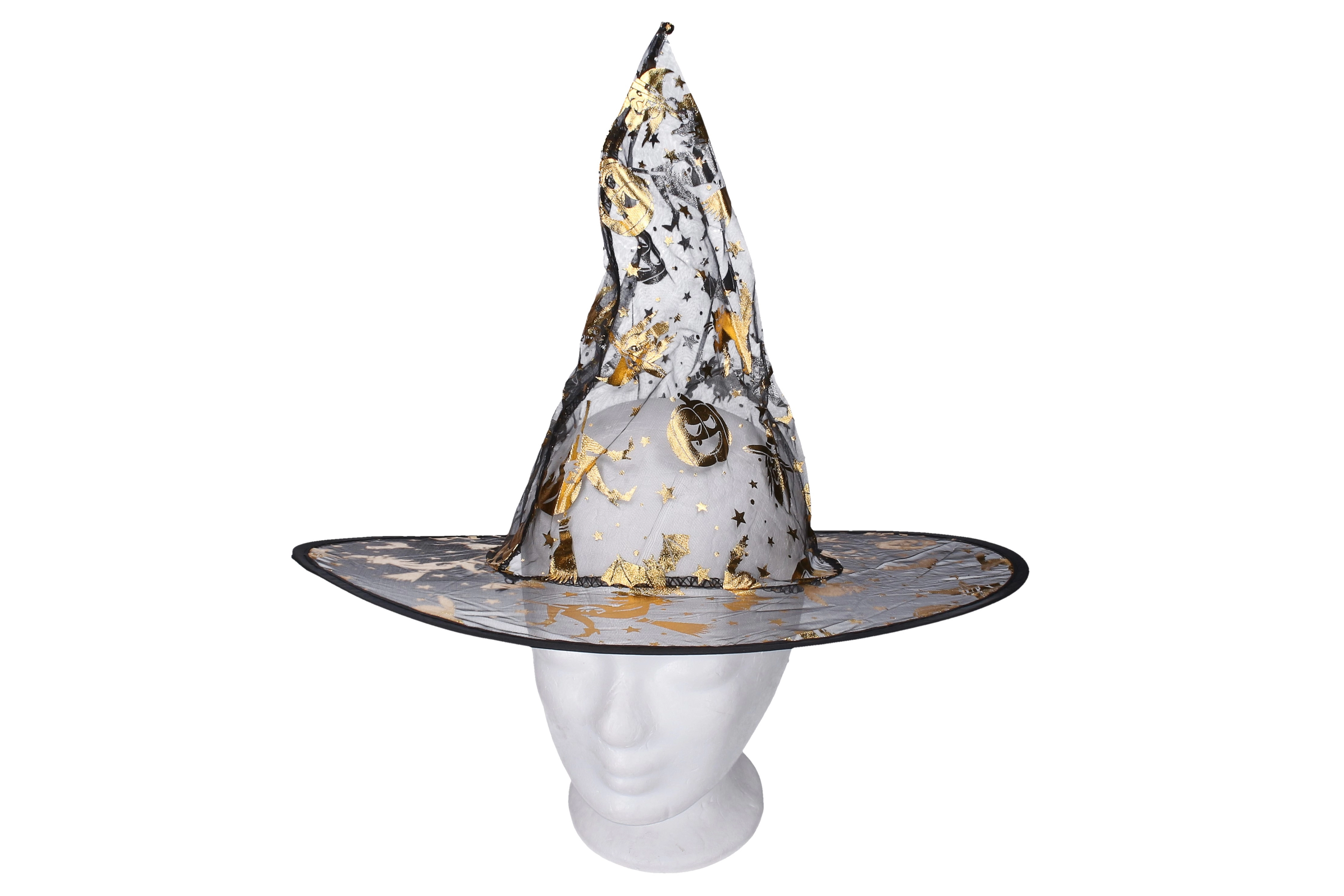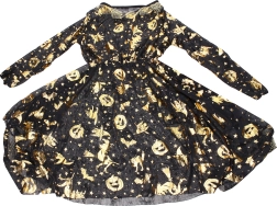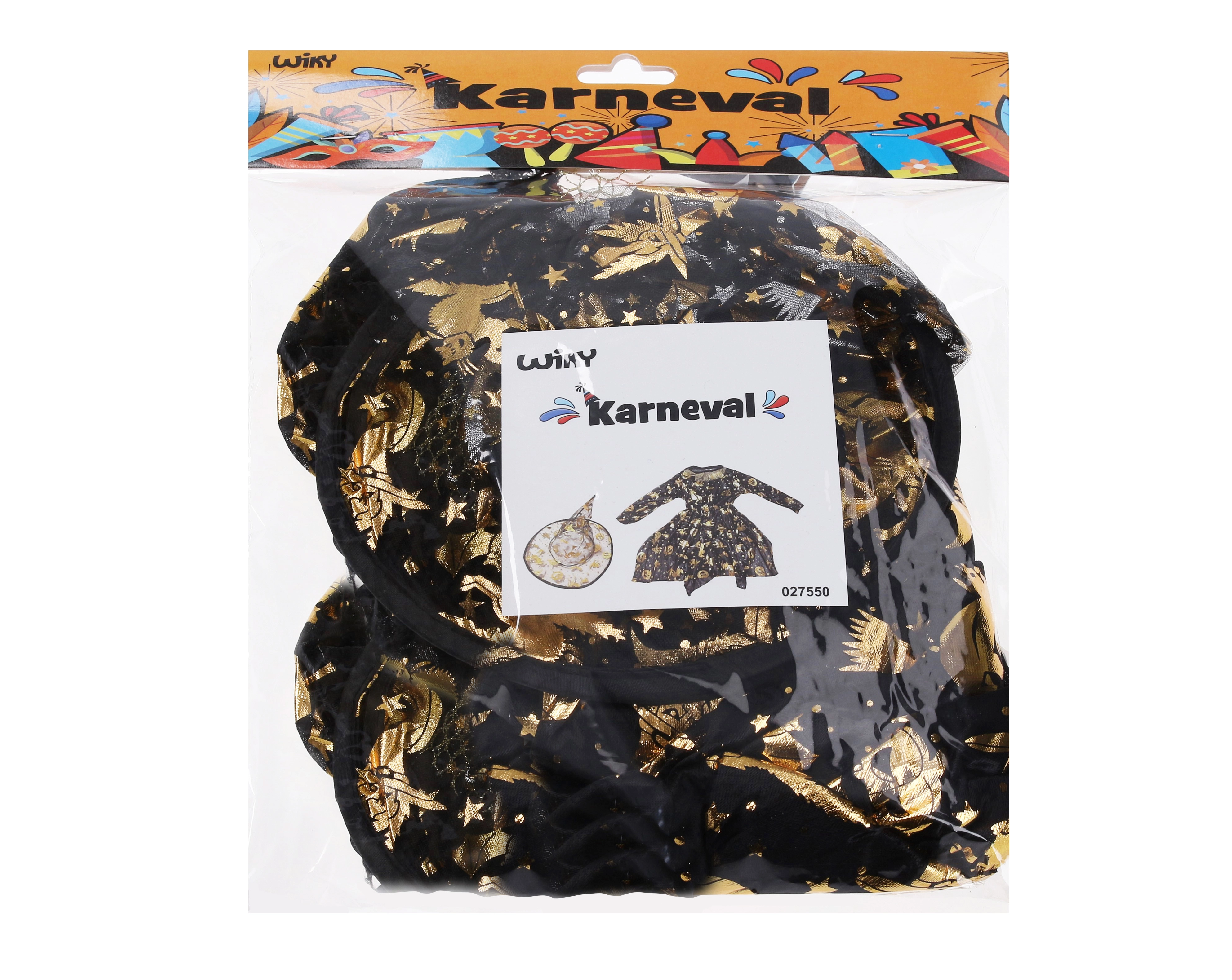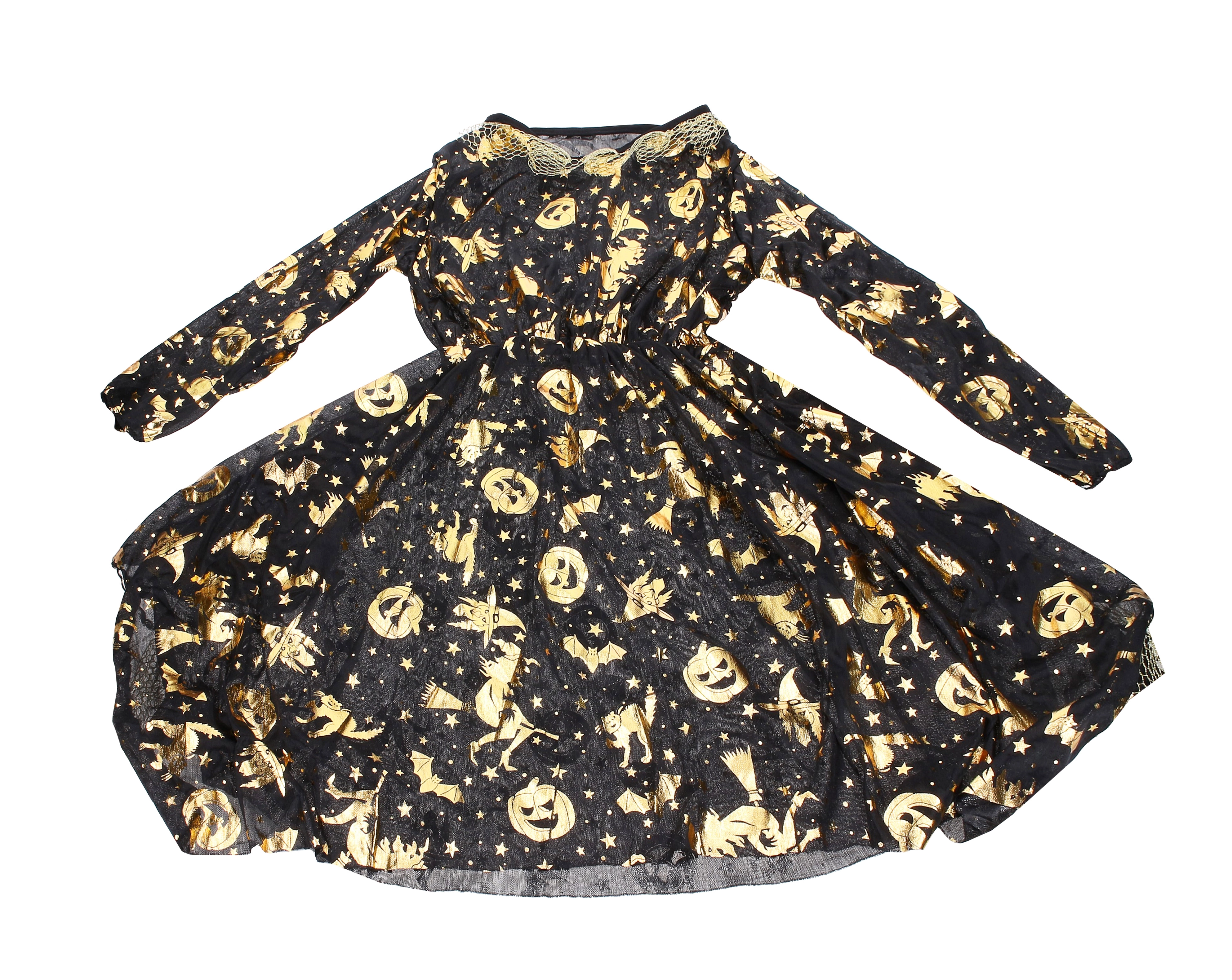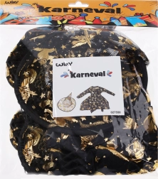 Elegantiškas karnavalinis raganos kostiumas auksinės spalvos su suknele ir skrybėle – puikus pasirinkimas karnavalui, maskaradu ir Helovinui. Galimi dydžiai S, M, L.