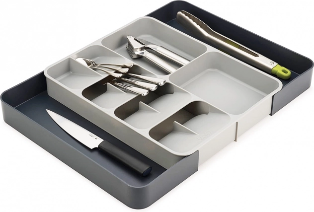 Virtuvinio stalčiaus organizatorius sukurtas taip, kad maksimaliai išnaudotų vietą ir užtikrintų aiškią tvarką jūsų stalo įrankiams ir virtuvės įrankiams. Dėl praplečiamos konstrukcijos jis prisitaiko prie skirtingų stalčių dydžių.