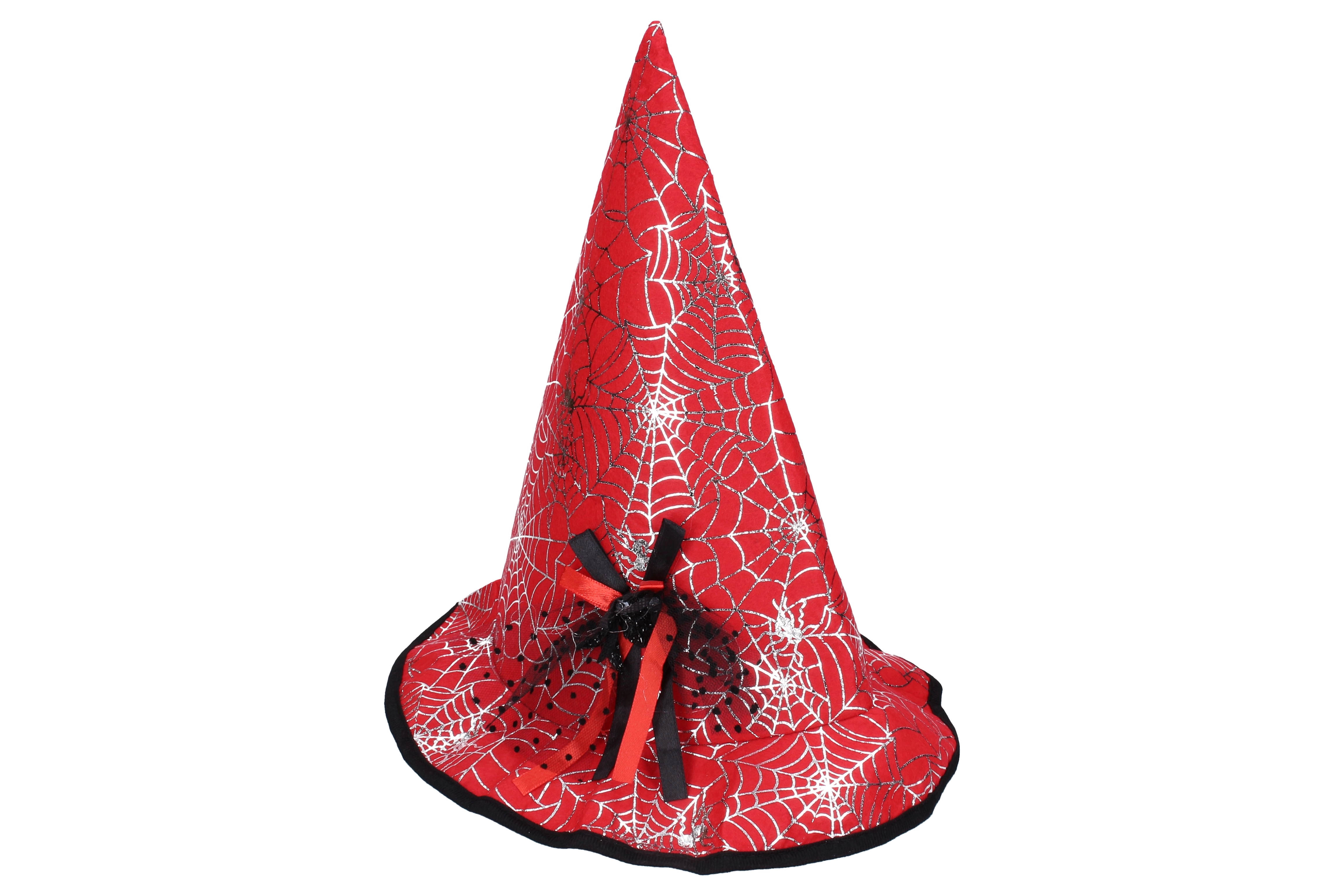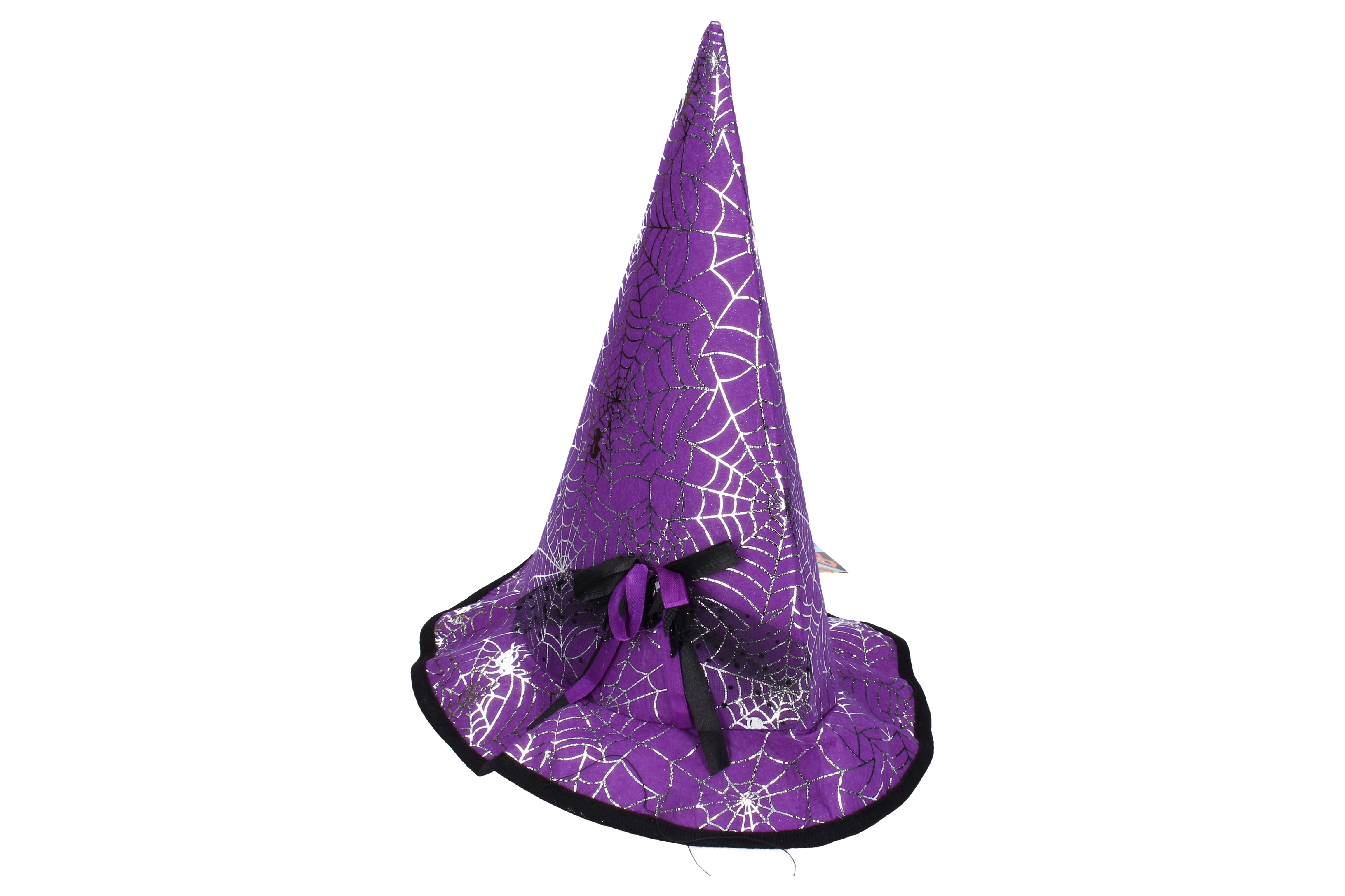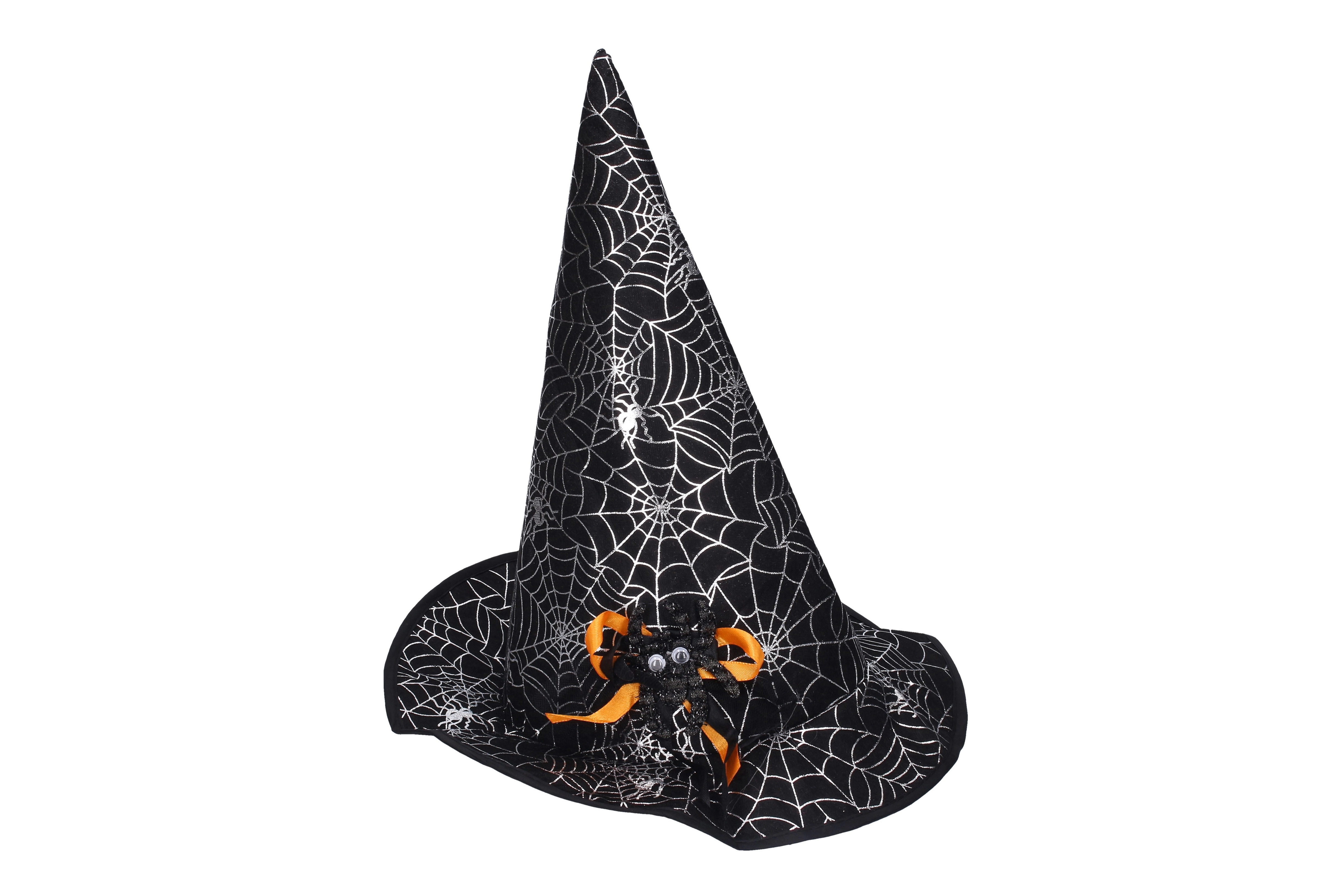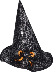 Graži juoda skrybėlė su voru ir sidabriniais voratinkliais – idealus aksesuaras visiems mažiesiems burtininkams.