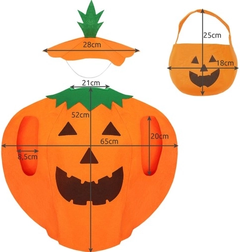 Šis moliūgo kostiumas – puikus pasirinkimas Helovinui ir teminiams vakarėliams. Pilnas rinkinys susideda iš moliūgo kostiumo, kepurėlės ir saldainių maišelio.