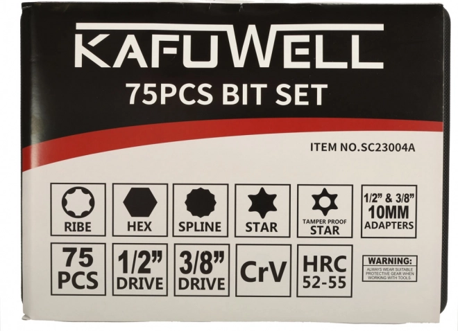 Universali KAFUWELL antgalių rinktinė su 75 dalimis derina galią ir tikslumą tiek dirbtuvėms, tiek namams. Patvarūs antgaliai iš CrV lydinio, trumpos ir ilgos versijos, tipai HEX, RIBE, SPLINE, TORX ir TORX Security bei papildomai 3 perėjimai 1/2" ir 3/8". Aiški ir praktinė transportavimo dėžė palaiko tvarką ir palengvina nešiojimą.