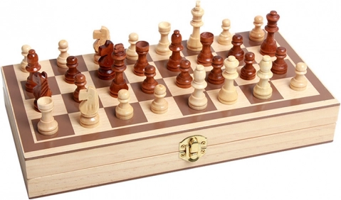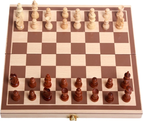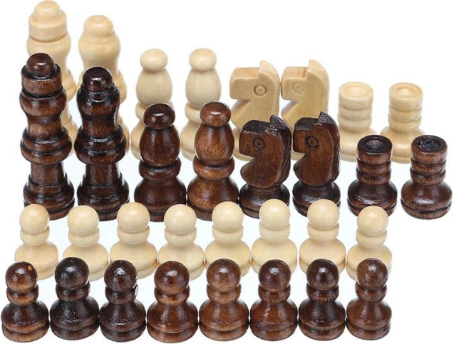 Pilnavertis šachmatų figūrų rinkinys natūralios ir tamsiai rudos spalvų. Puikiai tinka strategijai lavinti ir šeimos turnyrams.