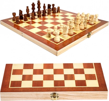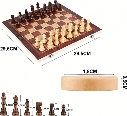 Šis universalus rinkinys siūlo tris klasikinius stalo žaidimus viename: šachmatus strateginiam mąstymui, damą su paprastomis taisyklėmis ir triktraką (backgammon) dinamiškam ir įtraukiančiam žaidimui. Sulankstoma medinė šachmatų lenta kartu tarnauja kaip dėžė saugiam figūrėlių ir žetonų laikymui.