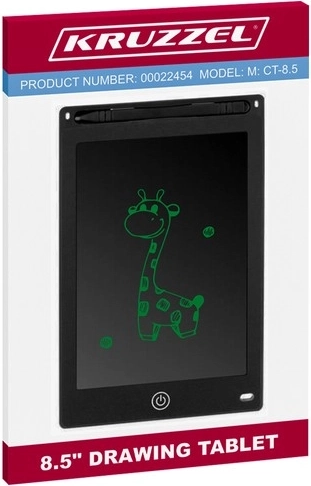 Kruzzel piešimo planšetė turi 8,5" įstrižainės ekraną, kuris reaguoja į prisilietimą bet kokiu daiktu, net ir nagu. Virš ekrano yra rašiklio laikiklis, leidžiantis patogiai jį laikyti.