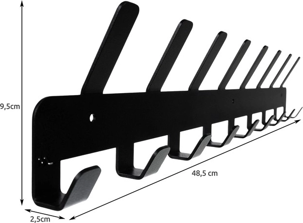 Tvarkingai sutalpinkite paltus, striukes, krepšius ir aksesuarus vienoje vietoje. Ši sieninė kabykla turi 9 apatinius ir 8 ilgesnius viršutinius kabliukus, todėl vietos pakaks visai šeimai. Minimalistinis dizainas ir juoda spalva puikiai dera tiek moderniuose, tiek klasikiniuose interjeruose.