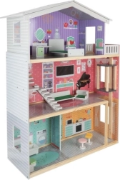 Didelis medinis KRUZZEL lėlių namelis, kurio aukštis 114 cm, siūlo 3 aukštus, 4 kambarius ir balkoną, veikiantį rankinį liftą ir gausią baldų įrangą. Dėl stabilios konstrukcijos iš MDF ir medžio jis yra saugus, kruopščiai apdirbtas ir skatina kūrybišką žaidimą, pilną fantazijos.