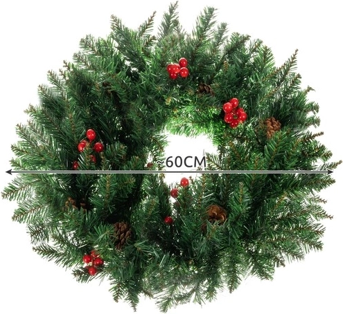 Stilingas dizainas – dirbtinis kalėdinis vainikas yra puikus bet kurios erdvės akcentas. Su juo galite kurti išskirtines kompozicijas ne tik svetainei, bet ir prieškambariui ar įėjimo durims. Vainikas papuoštas dirbtinėmis kankorėžiais ir šakelėmis su raudonomis uogomis.