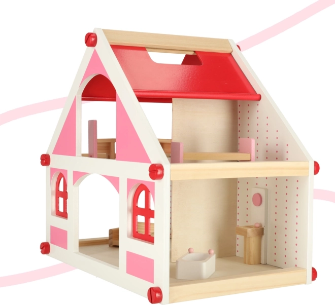 Mielas medinis lėlių namelis rožinės ir baltos spalvų derinyje suteikia valandas kūrybiško žaidimo. Jis turi du aukštus, atidaromus langus ir duris, o komplekte yra pilnas baldų rinkinys (vonia, sofa, fotelis, dvi kėdės, praustuvas, lova ir stalas). Kruopščiai šlifuota mediena užtikrina saugų žaidimą, o surinkimą lengvai atliksite dėka pridėtų varžtelių ir atsuktuvo.