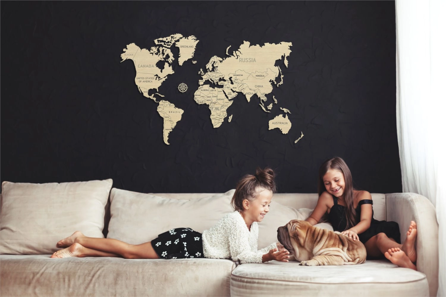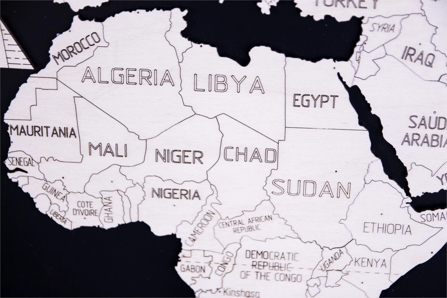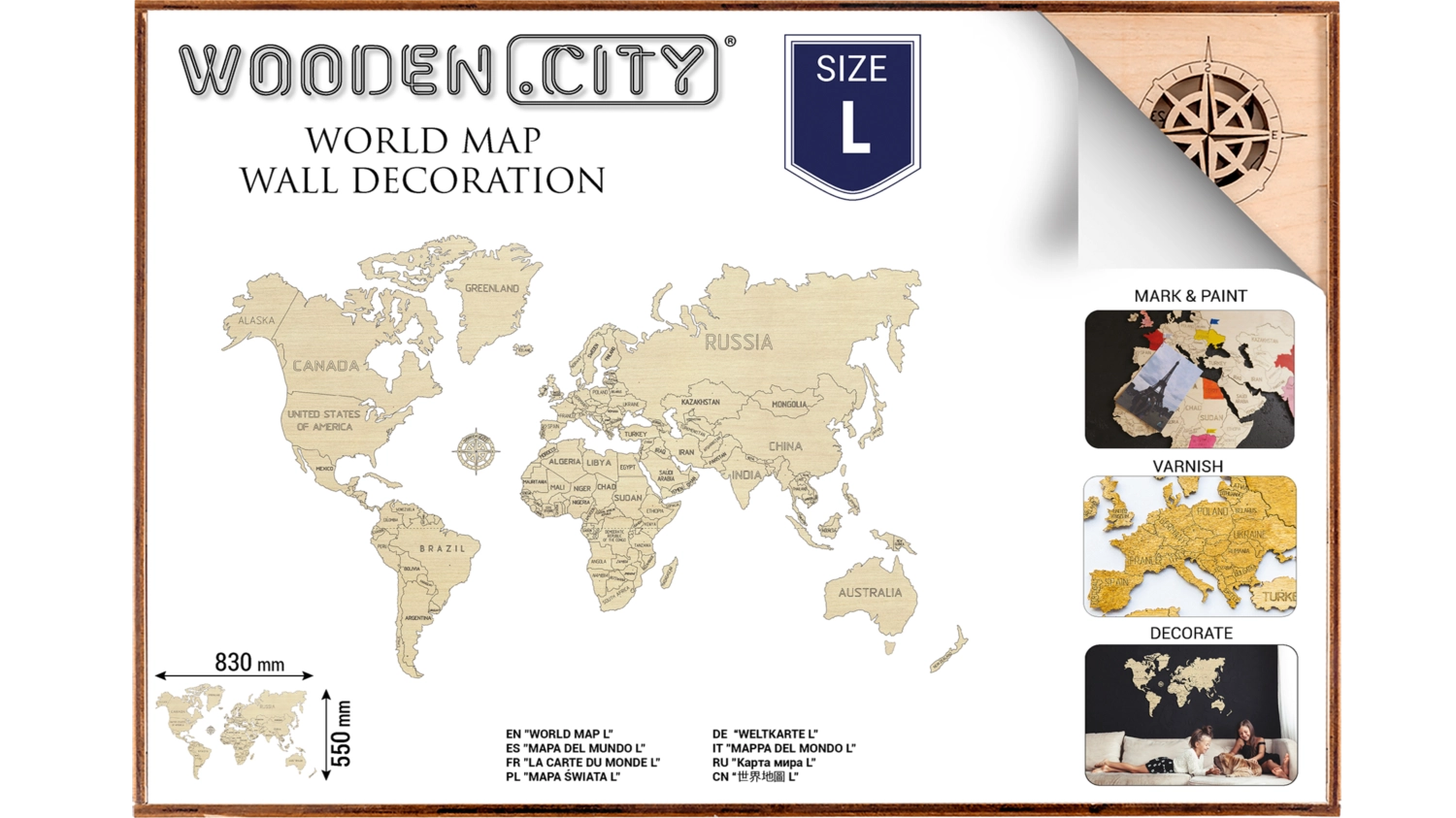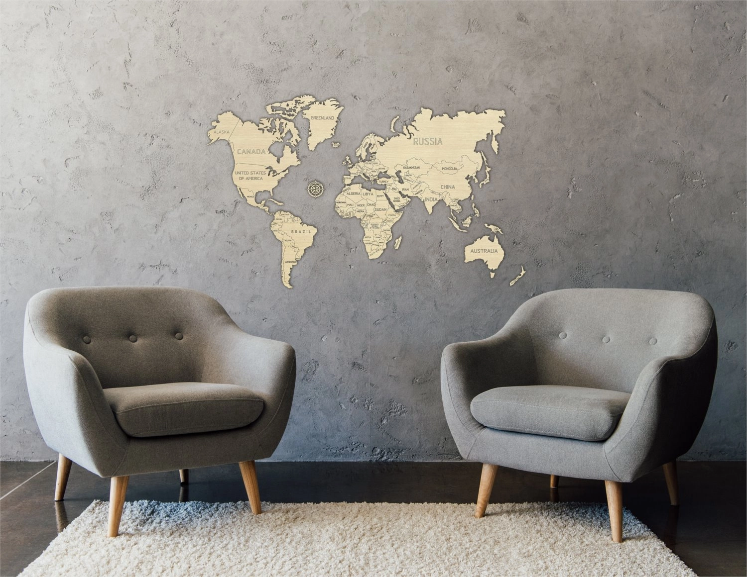 Žemėlapis išpjaustytas iš beržo faneros, kuri interjerui suteikia natūralią ir elegantišką išvaizdą.
