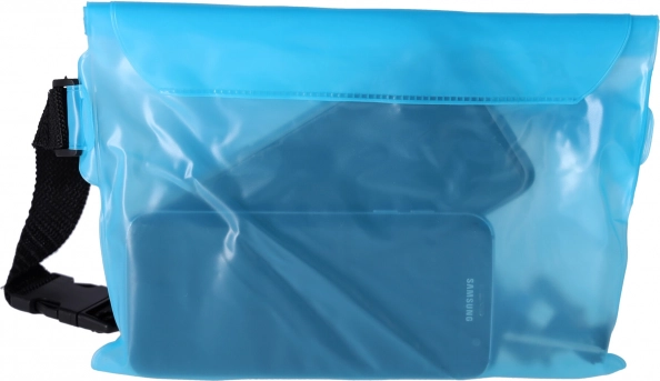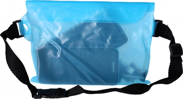 Praktiškas ir stilingas vandeniui atsparus juosmens krepšys šviesiai mėlynos spalvos apsaugo jūsų telefoną, dokumentus, raktus ir grynuosius nuo vandens ir smėlio. Dėl skaidrios medžiagos leidžia valdyti jutiklinį ekraną, turi reguliuojamą dirželį ir saugų užsegimą lipnia juostele. Idealu paplūdimiui, baseinui ir vandens sportui.