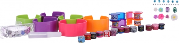 - spalvotos gumelės, papuošalų dekoracijos/akmenėliai, sluoksniavimui skirti žiedeliai ir diskai, apyrankių dirželiai