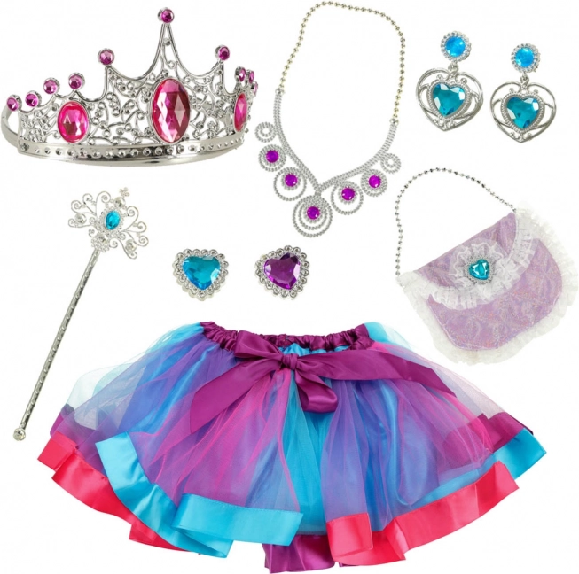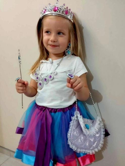 Stebuklingas 9 dalių rinkinys akimirksniu pavers kiekvieną vaiką tikra princesė. Ryškiaspalvis tutu sijonėlis rožinės, violetinės ir mėlynos tonų išsiskiria pūstais tiulio sluoksniais ir patogiu liemeniu. Elegantiška tiara su rožiniais akmenimis, žvilgantis vėrinys ir auskarai pabrėžia šventišką įvaizdį, o stebuklinga lazdelė ir žavus rankinukas užbaigia visą aprangą.