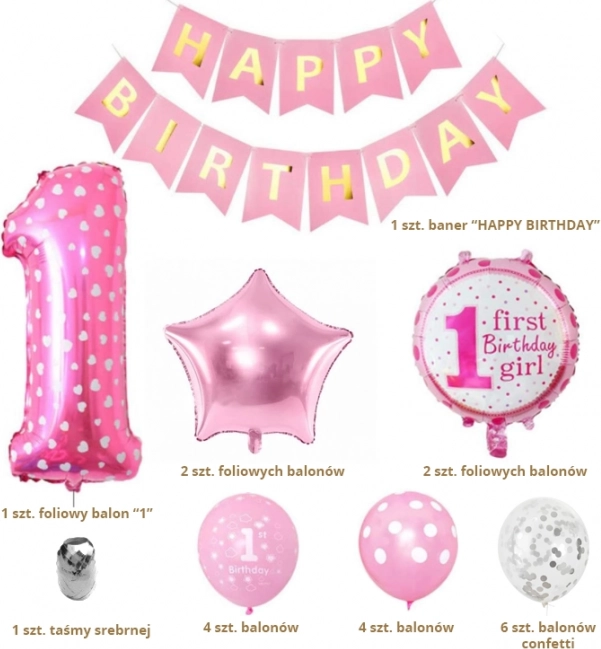 Balionus galite pripūsti oru (pakabinti ar pritvirtinti prie sienos) arba heliu, kad jie laisvai sklandytų ir suteiktų šventei iškilmingumo. Rožiniai, žaismingi motyvai puikiai tinka pirmojo gimtadienio temai ir sukurs gražų foną nuotraukoms su jubiliate ir svečiais.