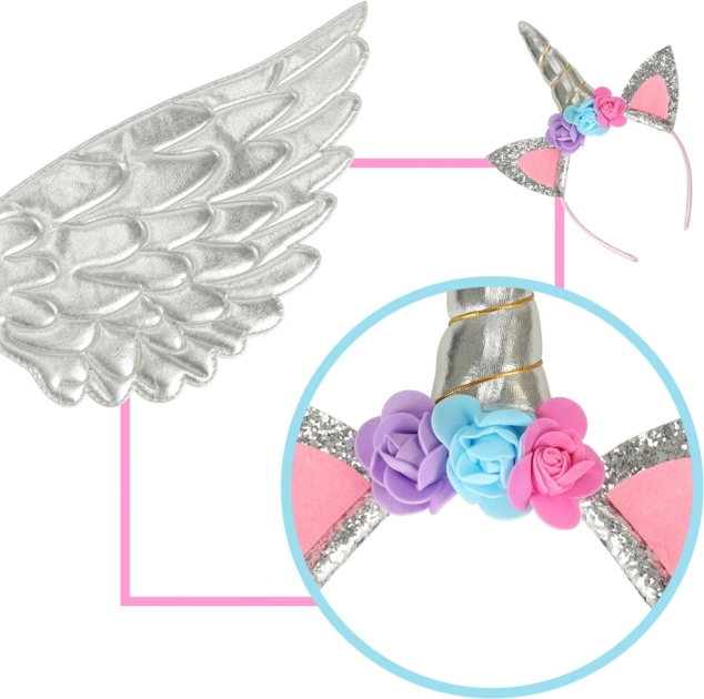 Šis nuostabus kostiumas leis paversti jūsų vaiką išskirtiniu vienaragiu. Jį sudaro sidabrinis sijonas, elegantiški sparnai ir kruopščiai pagamintas lankelis su gėlelėmis. Idealu bet kokiai progai, kai vaikas gali mėgautis pasakišku žaidimu.