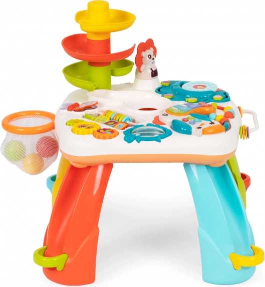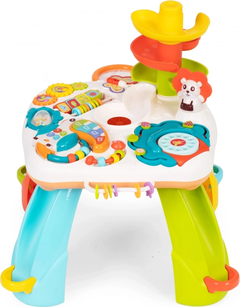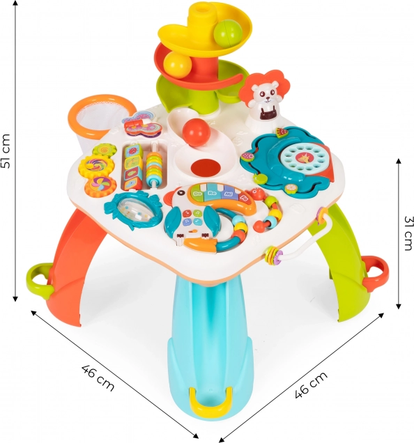 Edukacinis staliukas – tai ne tik puikus būdas leisti laiką, bet ir skatinti vaiko raidą. Žaislas turi daug manipuliacinių elementų, pavyzdžiui, muzikinį tukaną, barškutį, spalvotus karoliukus, besisukančius elementus ir telefono skambinimo diską, kurie padeda lavinti smulkiąją motoriką ir koordinaciją.