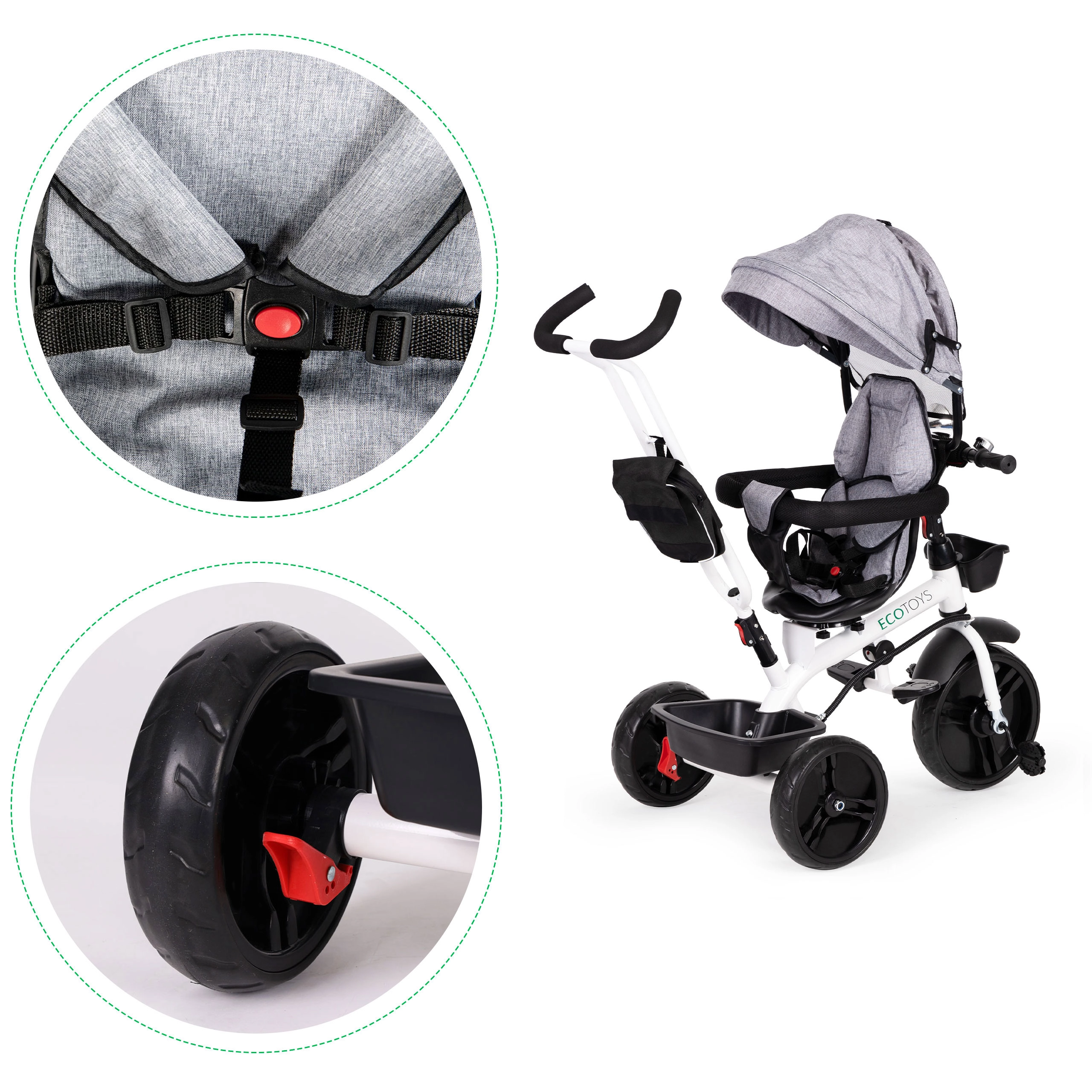 Vairo juosta leidžia suaugusiajam patogiai stumti ir nukreipti triratuką. Penkių taškų diržai, apsauginė juosta ir stovėjimo stabdis ant galinių ratų užtikrina kontrolę važiavimo metu.