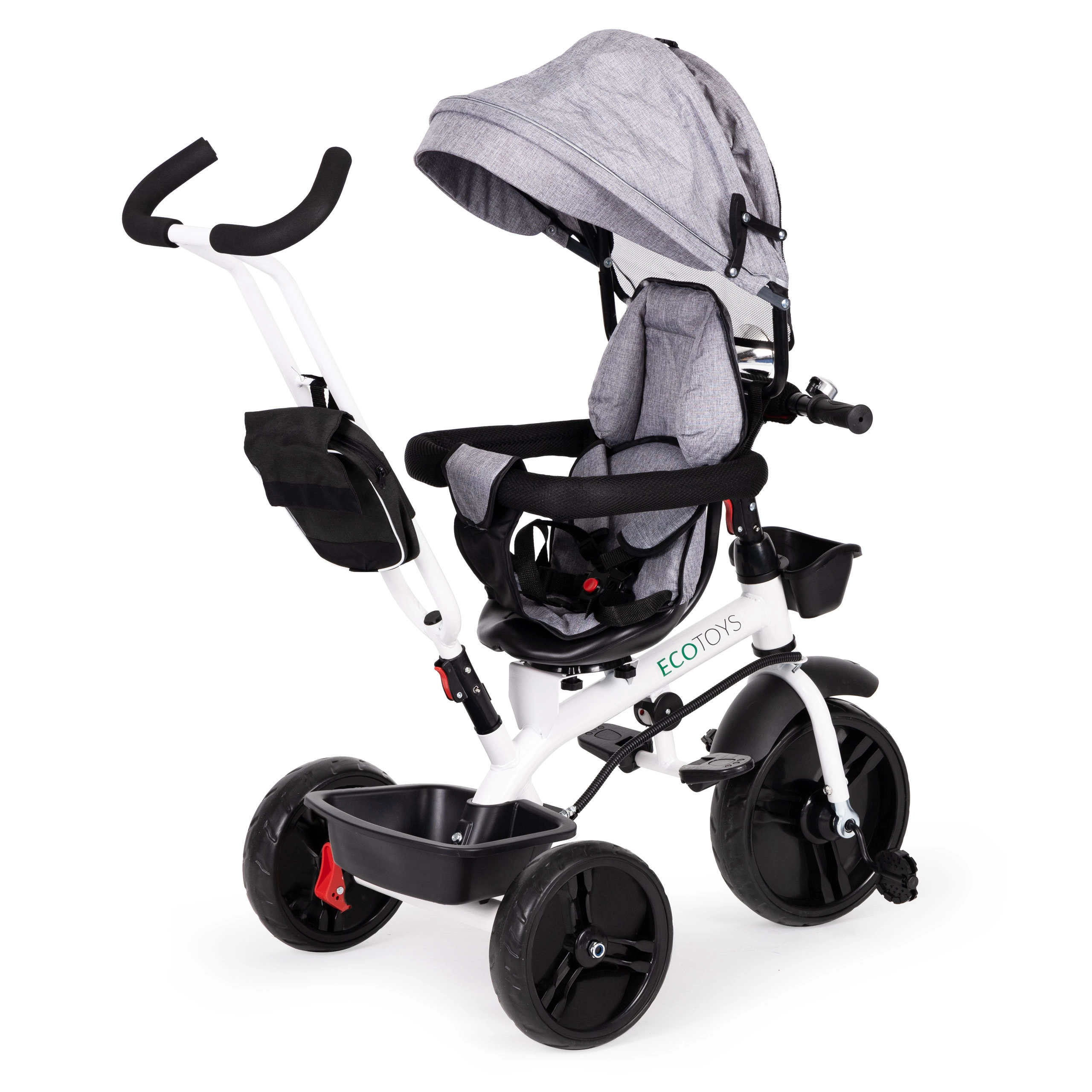 Tylūs ir patvarūs EVA ratai nereikalauja pripūtimo. Sulankstomos pakojos, reguliuojamas stogelis, krepšeliai ir dėkliukas didina vaiko ir tėvų patogumą.