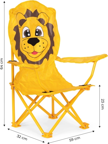 Žavinga vaikiška kempingo kėdutė su liūto motyvu siūlo lengvą ir stabilią konstrukciją iš plieno, greitą sulankstymą ir patogią sėdėseną sodui, stovyklavimui ar paplūdimiui. Patvarus 600D poliesterio užvalkalas su PU danga yra atsparus orų poveikiui ir lengvai prižiūrimas. Rinkinyje yra praktiškas nešiojamas krepšys, kad būtų paprasta pernešti ir laikyti.