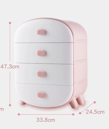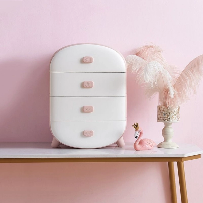Užapvalinti kampai, modernus dizainas ir švelni rožinė–balta spalva puikiai įsilieja į interjerą. Komoda lengva, stabili ir paprastai prižiūrima – pakanka nuvalyti drėgna šluoste. Gali tarnauti ir kaip originalus naktinis staliukas arba pagalbininkas tualetiniame stalelyje.