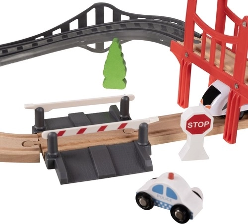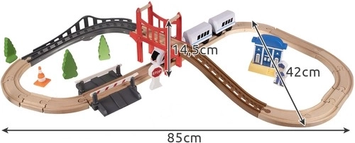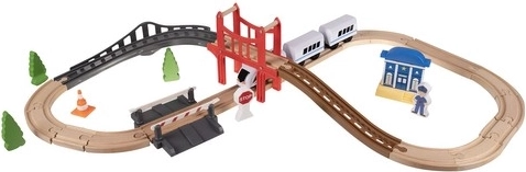 Šis medinis traukinio bėgių rinkinys – idealus sprendimas, skatinantis vaikų kūrybiškumą ir vaizduotę. Jis sukurtas taip, kad vaikai galėtų pasinerti į geležinkelio pramogų pasaulį namuose ar lauke. Rinkinyje iš viso yra 37 preciziškai apdirbti elementai, įskaitant tiltą ir pastatus, kurie suteikia žaidimui realistiškų detalių.