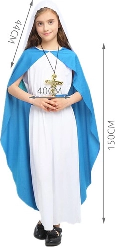 Šį tradicinį Mergelės Marijos kostiumą sudaro ilga balta suknelė su mėlynu apsiaustu, kuri subtiliai ir įtaigiai perteikia personažo kuklumą ir atsidavimą. Dėl lengvo ir minkšto poliesterio vaikams patogu jį dėvėti, jis nespaudžia ir leidžia laisvai judėti pasirodymų ir žaidimų metu.