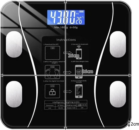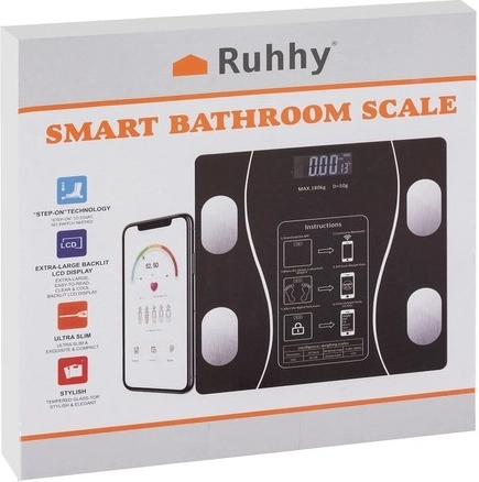 Stebėkite savo fizinę būklę su išmaniomis RUHHY svarstyklėmis. Dėl keturių tikslių jutiklių ir Bluetooth ryšio gausite detalią kūno analizę tiesiai telefone. Stiklinė platforma iš grūdinto stiklo elegantiškos juodos spalvos puikiai tiks bet kuriame vonios kambaryje ir suteiks saugų, stabilų matavimą iki 180 kg.