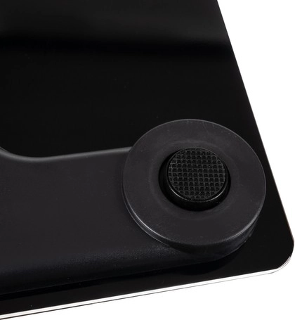 Stilinga juoda platforma iš 0,3 cm grūdinto stiklo atlaiko iki 180 kg ir užtikrina stabilų bei saugų naudojimą vonios kambaryje.