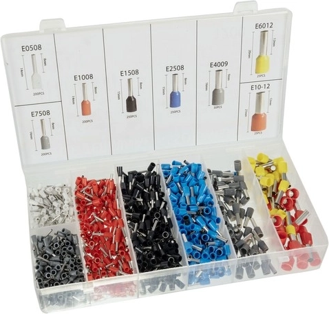 - 200× 0,50 mm² (balta), 200× 0,75 mm² (šviesiai pilka), 200× 1,00 mm² (raudona), 250× 1,50 mm² (juoda), 250× 2,50 mm² (mėlyna), 50× 4,00 mm² (pilka), 25× 6,00 mm² (geltona), 25× 10,00 mm² (raudona) – ilgiai 8–12 mm