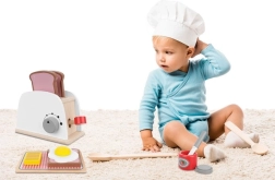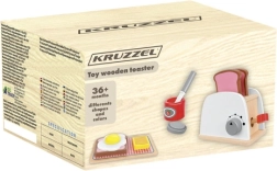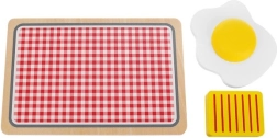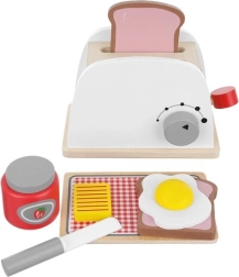 Pilnas pusryčių rinkinys mažiesiems virėjams: medinis skrudintuvas, 2 skrebučių riekės, kiaušinis „saulėta pusė“, sūris, medinis peilis, uogienės stiklainėlis ir serviravimo padėklas. Vaikai gali paruošti realistiškus pusryčius, mėgdžioti suaugusiuosius ir pažinti formas bei spalvas. Natūralios medžiagos yra patvarios ir saugios kasdieniam žaidimui.