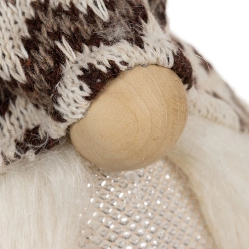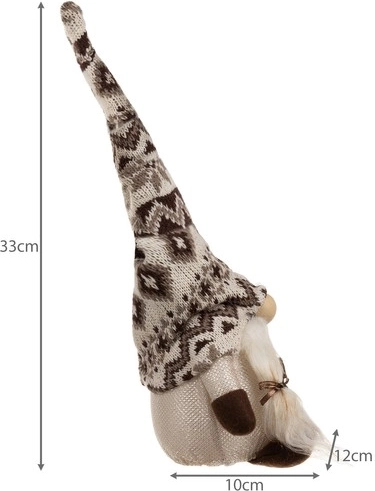 Nykštukas su megzta raštuota kepure ir dirbtiniu kailiu suteikia jaukų, kaimišką įvaizdį – idealu šventinei dekoracijai.