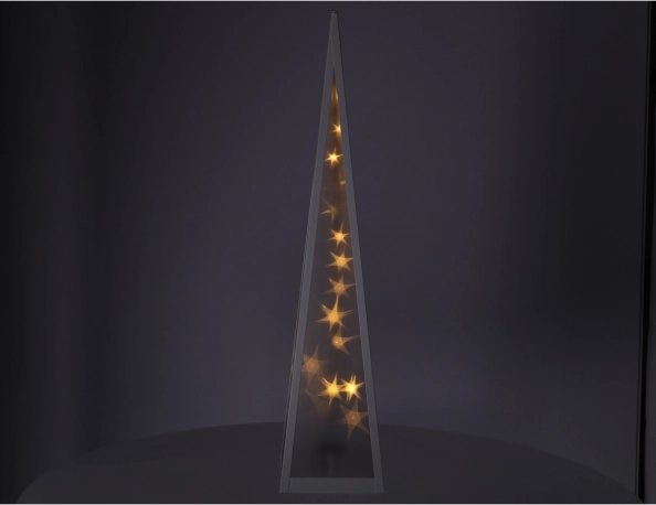 Stilinga kalėdinė piramidės formos dekoracija su besisukančiomis žvaigždėmis užlies interjerą šilta balta šviesa. Tvirta plastiko ir balto metalinio rėmo kombinacija užtikrina patvarumą, o taupios LED lemputės – mažas sąnaudas. Idealiai tinka kalėdinei puošybai svetainėse, prieangiuose ar ant palangių.