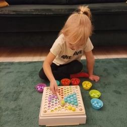 Medinė dėlionė padeda lavinti smulkiąją motoriką, koordinaciją ir loginį mąstymą. Vaikai taip pat ugdo kantrybę ir susikaupimą kurdami raštus.