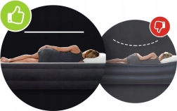 Patentuota Dura-Beam Fiber technologija naudoja tūkstančius tvirtų skaidulų, kurios paskirsto kūno spaudimą ir išlaiko čiužinį stabilų visą naktį. Taip palaikoma sveika stuburo padėtis ir kokybiškas miegas be įdubimų. Integruotas elektrinis siurblys (220–240 V) pripučia lovą maždaug per 250 s, o Bostono vožtuvas užtikrina greitą oro išleidimą ir patogų laikymą.