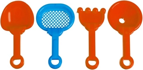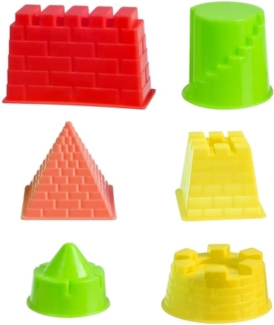Pakanka medžiagos ilgoms kūrybinėms valandoms: 2 kg mėlyno smėlio, 14 formelių, grėbliai, sietelis, semtuvėlis ir piltuvėlis. Vaikai gali statyti pilis, kelius ir figūrėles.
