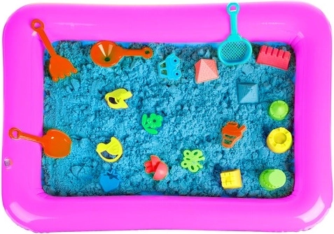 Ši didelė rinkinio versija turi viską, ko vaikams reikia statyti pilis, kelius ir gyvūnėlius. Mėlynas kinetinis smėlis iš kvarcinio smėlio yra minkštas, malonus liesti ir gali būti naudojamas pakartotinai – neišdžiūsta ir nekietėja. Pripučiama smėlio dėžė viską laiko kartu ir padeda palaikyti tvarką žaidžiant namuose.