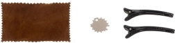 - žirklės ir šukos: nerūdijantis plienas; rankenos ir kita: ABS; 2 segtukai: derva; valymo šluostė: poliesteris; dėklas: eko oda
