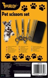 Pilnas jūsų šuns kailio kirpimo rinkinys patogiame dėkle. Aštrūs ašmenys iš nerūdijančio plieno, saugūs suapvalinti galiukai, ergonomiškos neslystančios rankenos ir gausi komplektacija (tiesios, retinimo ir lenktos žirklės, metalinis šukos, segtukai, valymo šluostė ir reguliavimo raktelis) užtikrina tikslų ir švelnų groomingą namuose ir salone.
