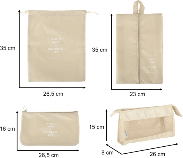 - 8 dalys viename rinkinyje – 4 drabužių kubai (XL, L, M, S), batų krepšys, sutraukiamas maišelis, kosmetinė ir maža kišenė.