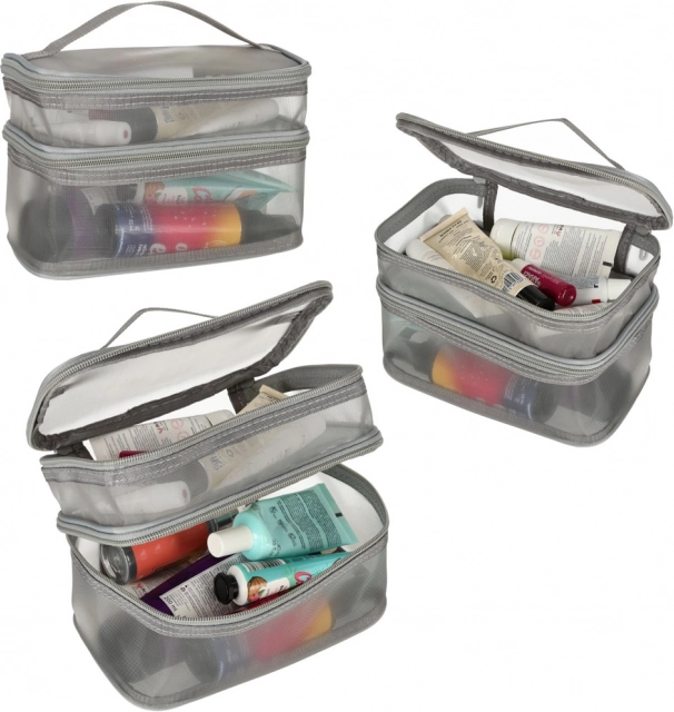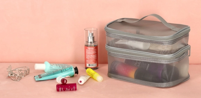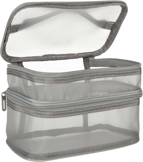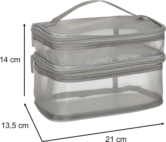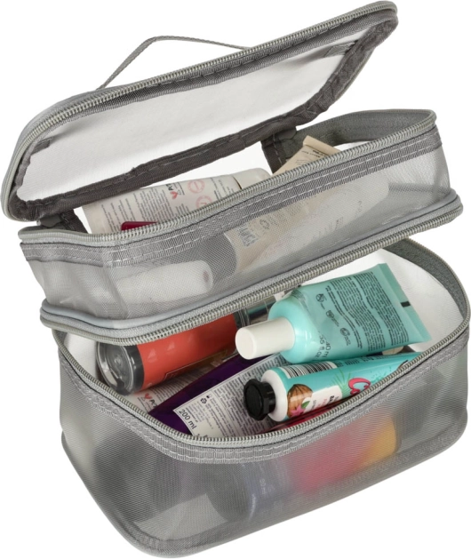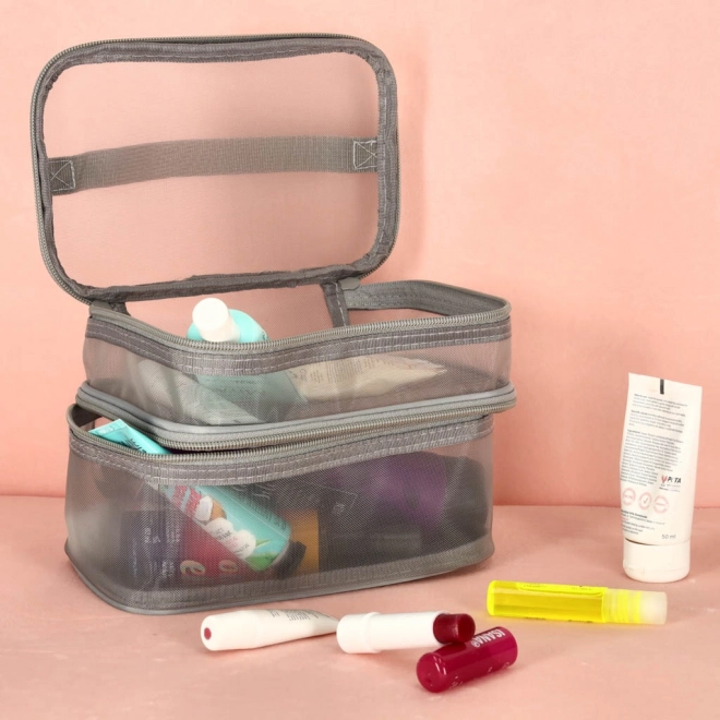Ši praktiška kosmetinė – būtinas aksesuaras kiekvienai kelionei. Dviejų skyrių dizainas leidžia lengvai susitvarkyti kosmetiką ir kitus asmeninius daiktus. Pagaminta iš tinklinės medžiagos, kuri padeda greitai rasti sudėtus produktus.