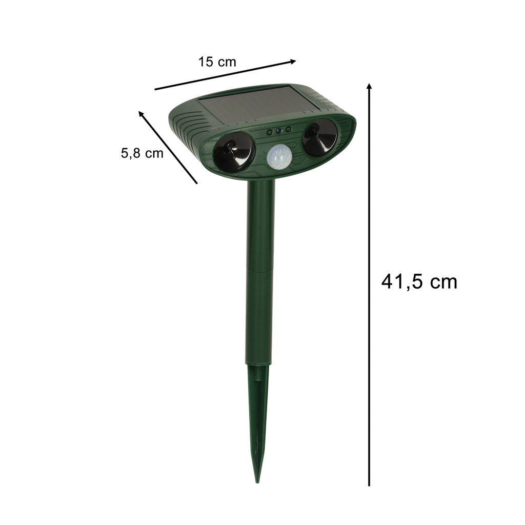 Saulės atbaidytuvas sukurtas veiksmingai atgrasyti žiurkes, peles, kiaunes, kates, paukščius ir kitus nepageidaujamus lankytojus, naudojant kintamo dažnio ultragarsą. Šis patogus naudoti įrenginys veikia su judesio jutikliu, kuris įsijungia tik tada, kai gyvūnas yra netoliese, taip maksimaliai taupant energiją.