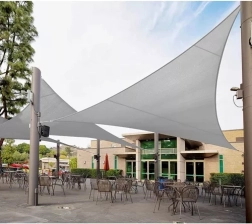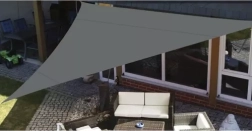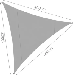 Trikampė 4 × 4 × 4 m forma sukuria malonų pavėsį virš terasos ar sodo poilsio zonos. Medžiaga mažina perkaitimą ir leidžia cirkuliuoti orui.